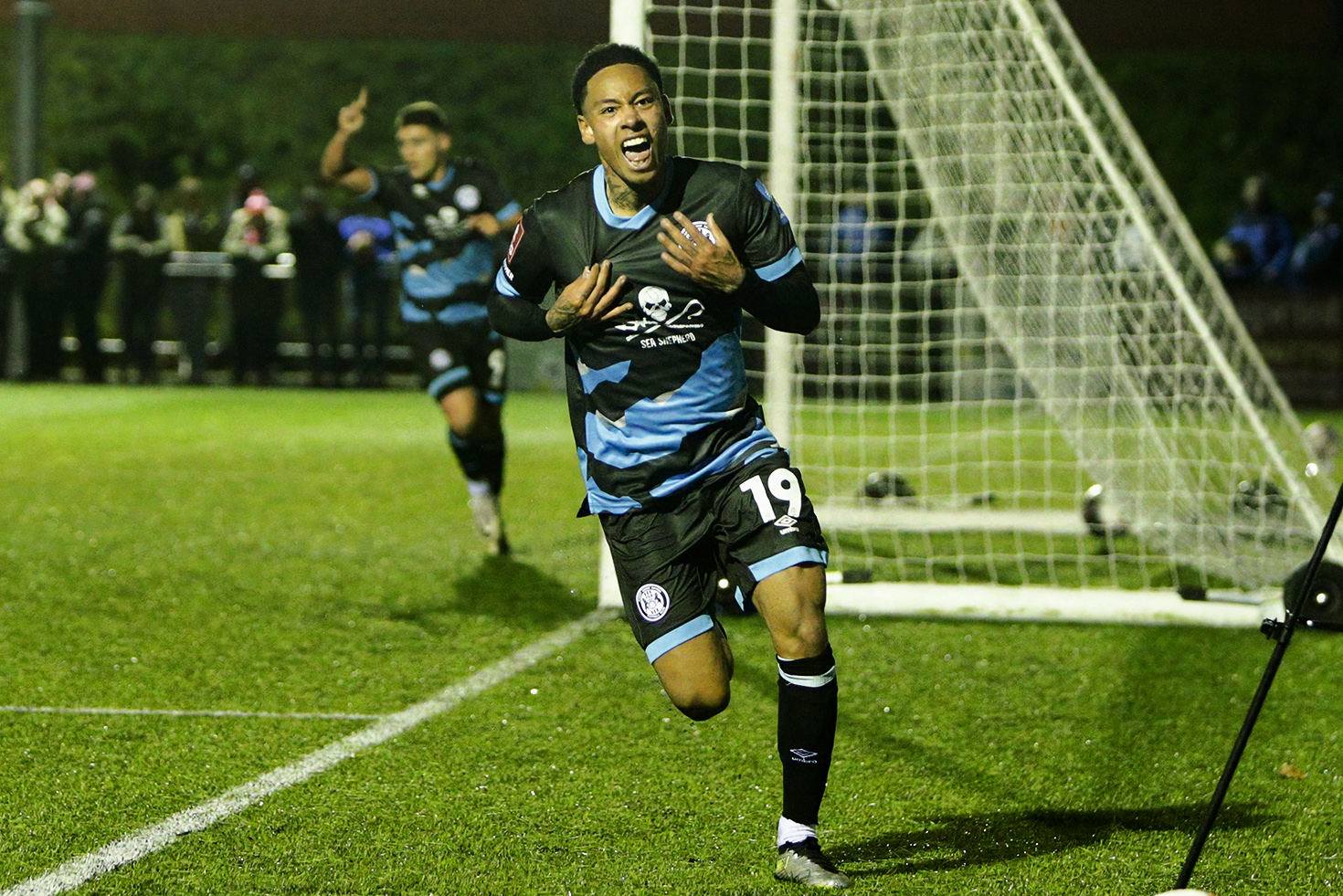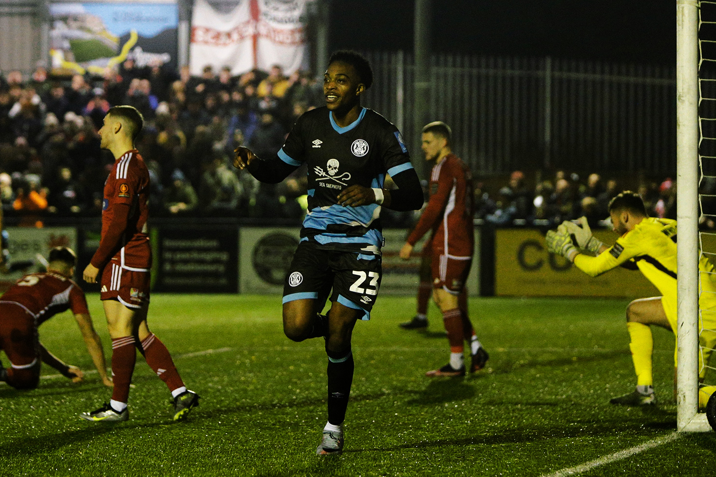 Cargill finds the back of the net, but is denied by the flag
