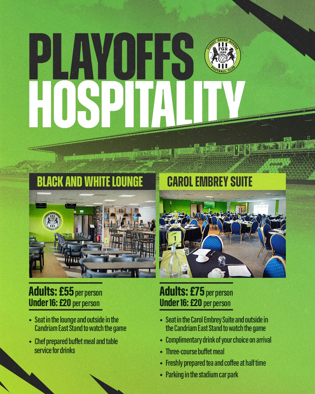 Enjoy our spectacular vegan food, exclusive access to a private lounge and watch the match in style for £75 from our Carol Embrey Suite. Supporters can book online HERE or email hospitality@fgr.co.uk.
