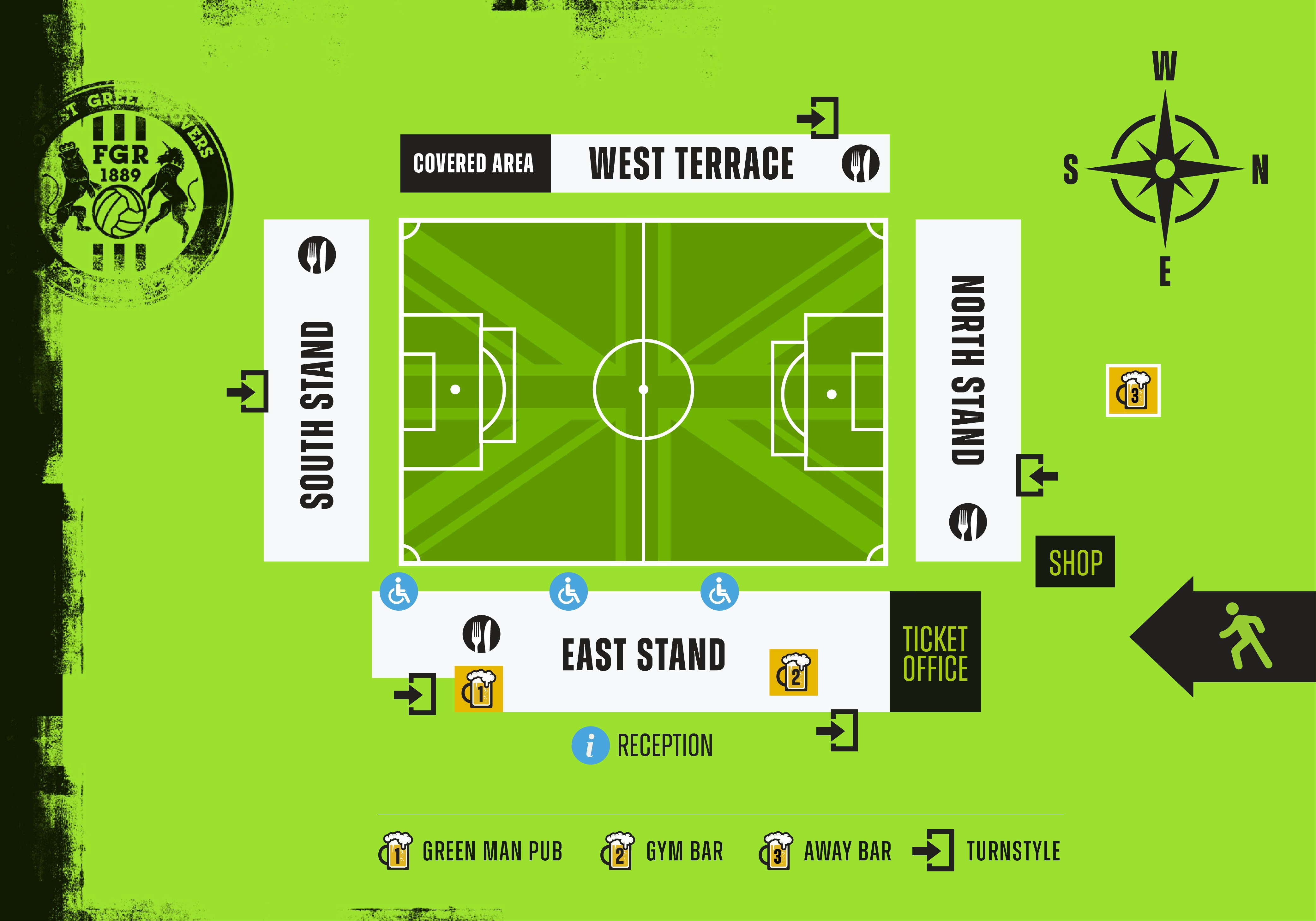 The Green Man - The Green Man is found on the ground floor of the East Stand and is a home supporters bar with plenty of space to sit and enjoy a drink and order food ahead of the game. The Green Man bar closes at kickoff.